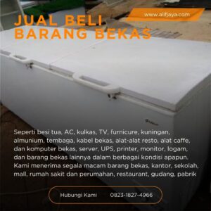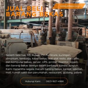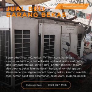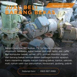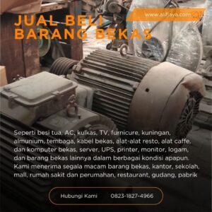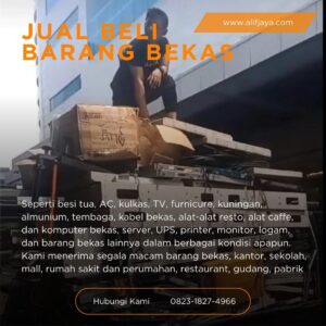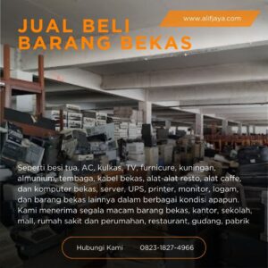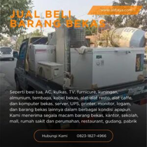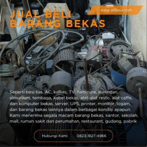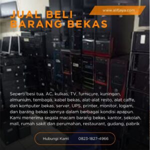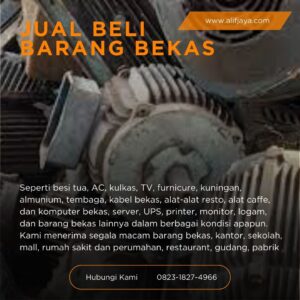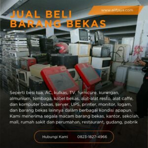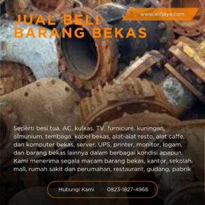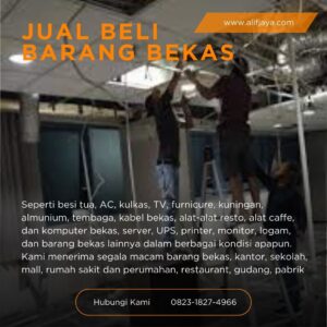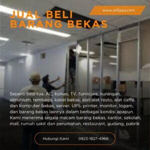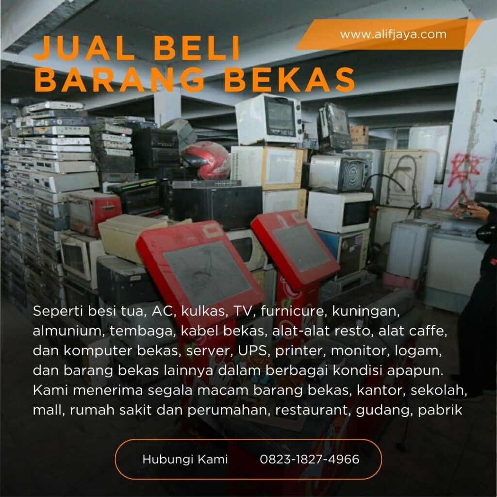 Besi tua, AC, kulkas, freezer, TV, Server, kursi kantor, partisi kantor, furnicure, kuningan, almunium, kabel bekas, alat resto, barang hotel, alat-alat caffe, genset, mesin-mesin pabrik, komputer, server, printer, Kami menerima segala macam barang bekas, kantor, hotel, sekolah, mall, rumah sakit dan perumahan, restoran, gudang, pabrik, yayasan, warnet di wilayah JABODETABEK dan sekitarnya